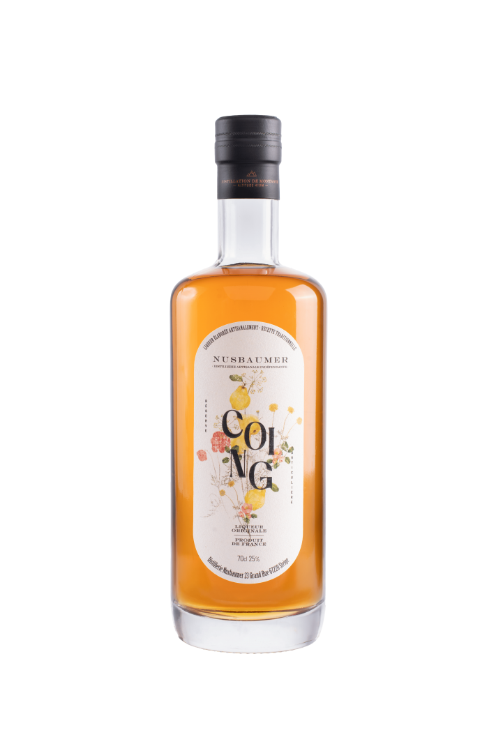 Cette liqueur est élaborée par macération d'une purée de coings dans notre eau-de-vie de Coing. Elle est ensuite réduite au degré, puis ajustée avec sirop de sucre avant filtration à froid.
